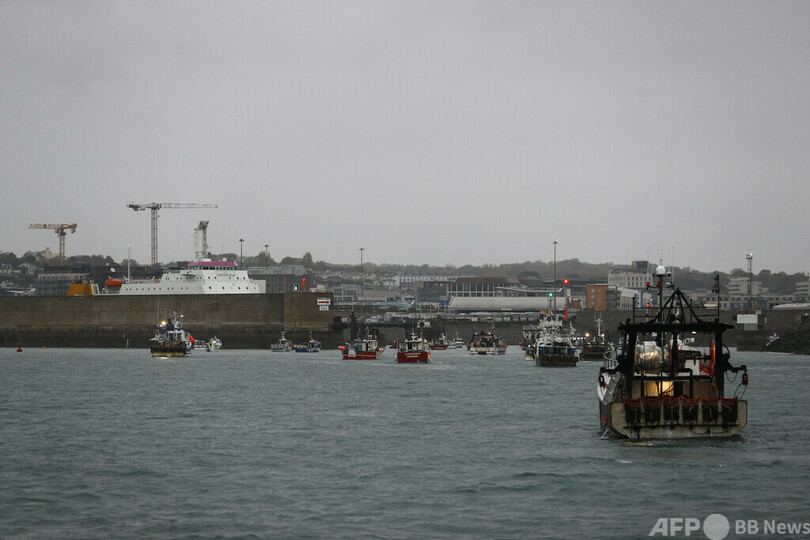 6月には激怒した仏漁業関係者がジャージー島の主要港に船団を集結させて抗議デモを行い、英国が海軍哨戒艇2隻を周辺海域に派遣する騒ぎに発展していた。(c)AFP/Sofia BOUDERBALA and Adam PLOWRIGHT