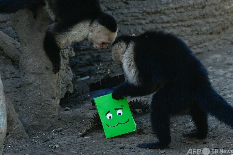 【10月30日 AFP】中米グアテマラの首都グアテマラ市のアウロラ(La Aurora)動物園で29日、ハロウィーンと死者の日を祝い、動物たちに怖い装飾を施したフルーツや、箱入りの好物がプレゼントされた。(c)AFP