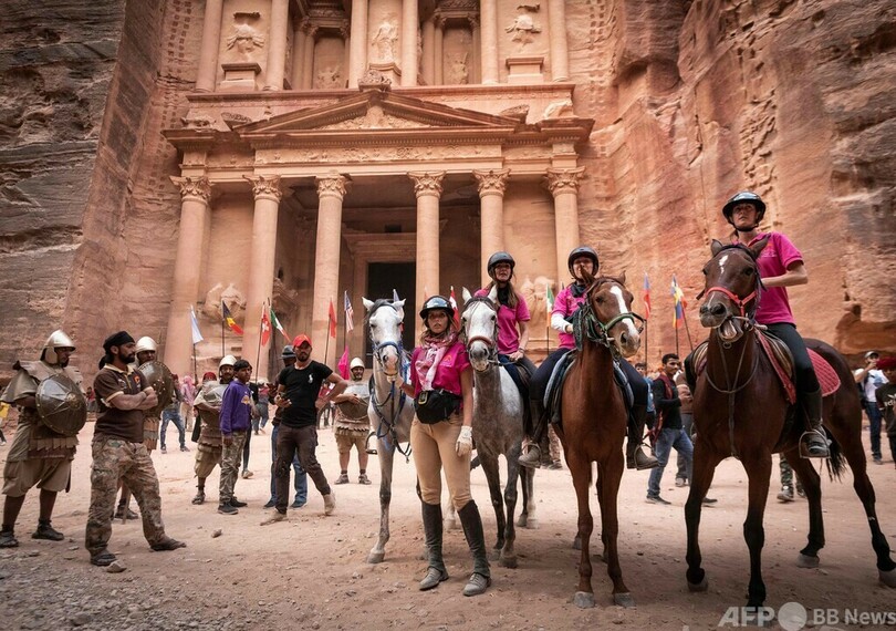 スタート地点のワディラムは、1962年の大作歴史映画『アラビアのロレンス』で主演のピーター・オトゥール(Peter O’Toole)の乗馬シーンが撮影された。ゴール地点のペトラのエルカズネ(宝物殿)は、1989年の大ヒット映画『インディ・ジョーンズ/最後の聖戦(Indiana Jones and the Last Crusade)』のロケ地となった。(c)AFP/Kamal Taha