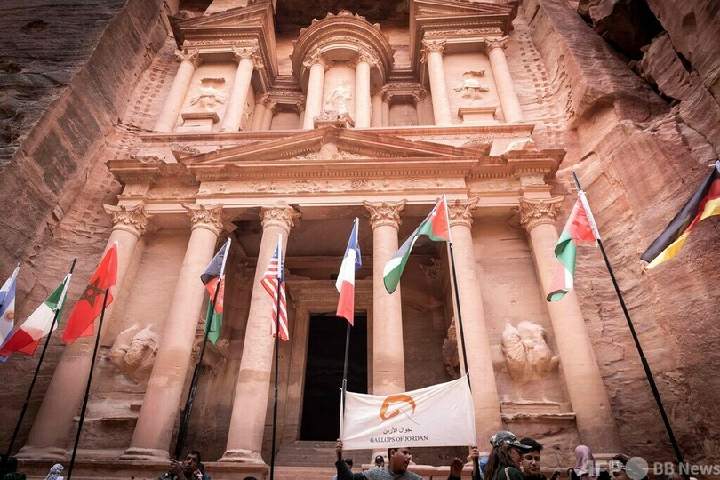 スタート地点のワディラムは、1962年の大作歴史映画『アラビアのロレンス』で主演のピーター・オトゥール(Peter O’Toole)の乗馬シーンが撮影された。ゴール地点のペトラのエルカズネ(宝物殿)は、1989年の大ヒット映画『インディ・ジョーンズ/最後の聖戦(Indiana Jones and the Last Crusade)』のロケ地となった。(c)AFP/Kamal Taha
