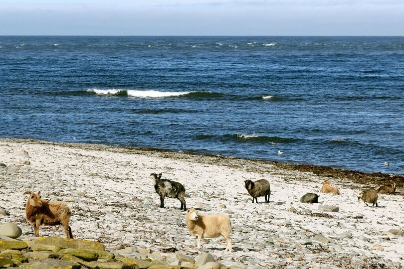海藻を食べるヒツジがいるのは、人口約60人のノースロナルドセー(North Ronaldsay)島。ターコイズブルーの海と岩だらけの浜に囲まれた、南北に5キロほど延びる小さな島だ。