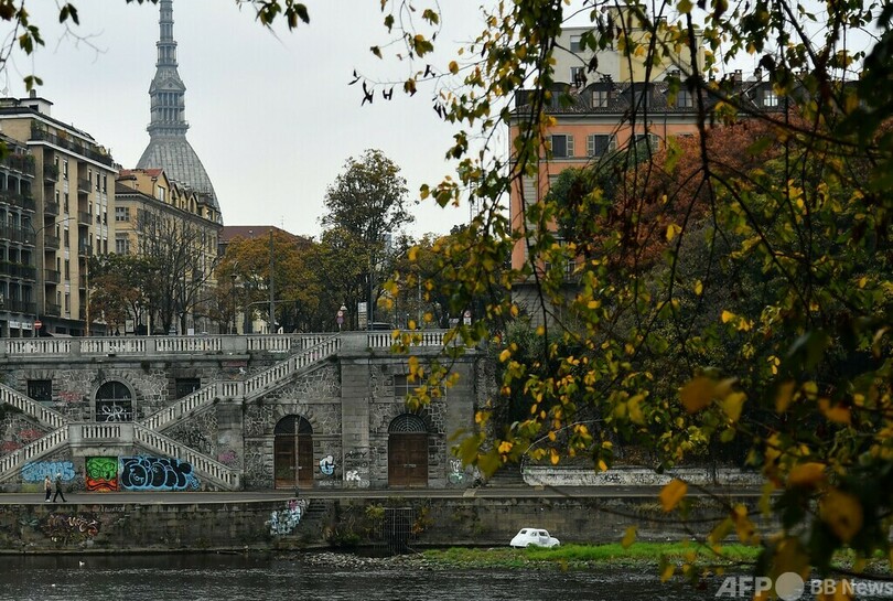 同国のアーティスト、ナザレノ・ビオンド(Nazareno Biondo)さんの作品で、トリノ市の歴史的建造物「パラッツォ・サルッツォ・パエサーナ(Palazzo Saluzzo Paesana)」で3日から始まる個展の一部として川辺に設置された。(c)AFP