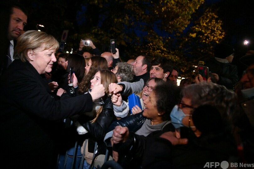 メルケル氏には夫のヨアヒム・ザウアー(Joachim Sauer)さんも同行。メルケル氏は出迎えた人々とこぶしを突き合わせるあいさつを交わした。群衆からは「アンゲラ、ブラボー!」の声も上がった。