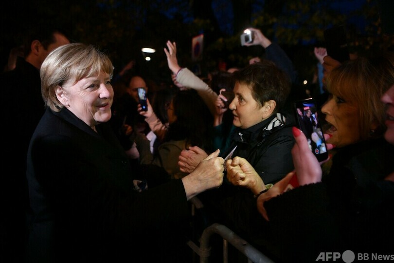 メルケル氏には夫のヨアヒム・ザウアー(Joachim Sauer)さんも同行。メルケル氏は出迎えた人々とこぶしを突き合わせるあいさつを交わした。群衆からは「アンゲラ、ブラボー!」の声も上がった。