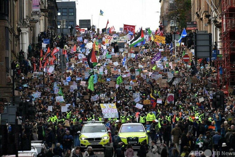 【11月6日 AFP】国連(UN)気候変動枠組み条約第26回締約国会議(COP26)が開催されている英北部グラスゴーで5日、各国首脳に対し気候問題への迅速な対処を求める若者主導の大規模な抗議デモが行われた。デモで演説したスウェーデンの環境活動家グレタ・トゥンベリ(Greta Thunberg)さんは、COP26を「失敗」と呼び批判した。