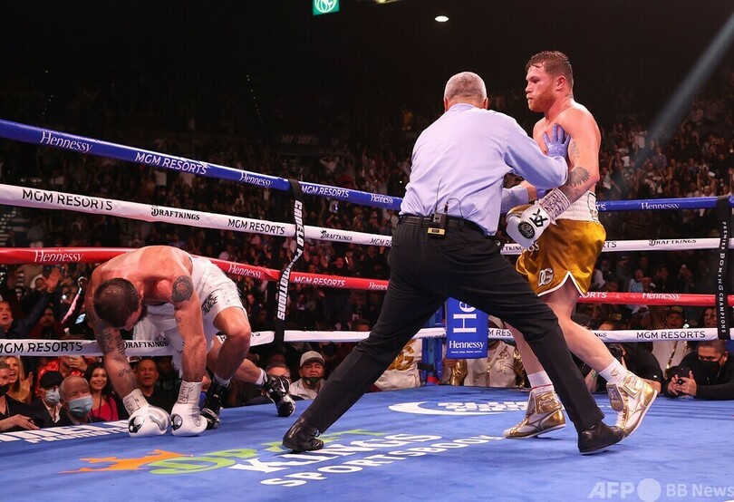 カネロ(Canelo)こと31歳のアルバレスは、11回に左フックから右アッパーのコンビネーションで1回目のダウンを取ると、立ち上がったもののまだ意識がもうろうとした様子のプラントを追い詰め、最後は左右の連打を浴びせて2回目のダウンを奪い、決着をつけた。
