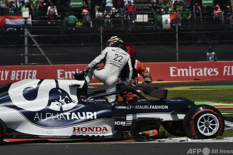 この接触は後方集団にも影響を与え、アルファタウリの角田裕毅(Yuki Tsunoda)とハース(Haas F1 Team)のミック・シューマッハ(Mick Schumacher)はリタイアとなった。(c)AFP