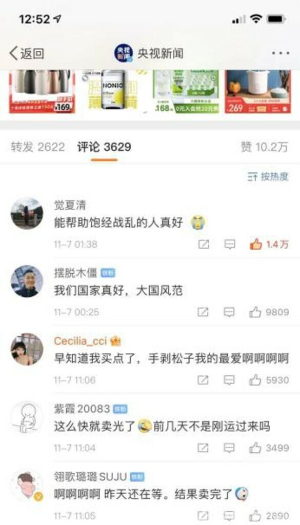 アフガニスタン産松の実は、対中輸出の主要農産物として今回のイベント前から注目されており、ライブコマースで何度も商品が追加され、最終的に12万缶、計26トンが完売しました。中国のSNSでは、「戦争を経験したアフガニスタンの人々を助けたい」との声が寄せられました。日本・韓国・タイの化粧品も長期間積み重ねられてきた口コミと魅力的な価格により売れ筋商品となりました。(c)CGTN Japanese/AFPBB News