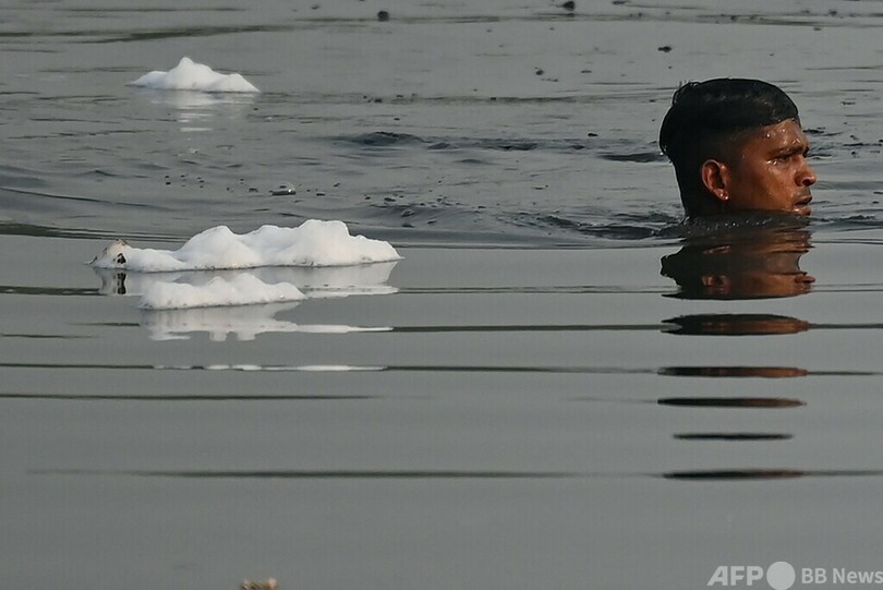 ヤムナ川はすでに汚染度が国内最高水準になっていたが、この日は川の一部が積雪のような白い泡で覆われた。市当局は、上流から先週流れ込んだ「大量の下水と産業廃棄物」が原因だとしている。だが川では、4日間にわたり太陽に祈りをささげる祭典「チャートプジャ(Chhath Puja)」の一環で沐浴(もくよく)をするヒンズー教徒の姿がみられた。