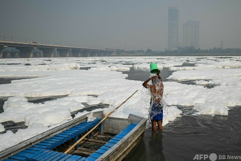 ヤムナ川はすでに汚染度が国内最高水準になっていたが、この日は川の一部が積雪のような白い泡で覆われた。市当局は、上流から先週流れ込んだ「大量の下水と産業廃棄物」が原因だとしている。だが川では、4日間にわたり太陽に祈りをささげる祭典「チャートプジャ(Chhath Puja)」の一環で沐浴(もくよく)をするヒンズー教徒の姿がみられた。