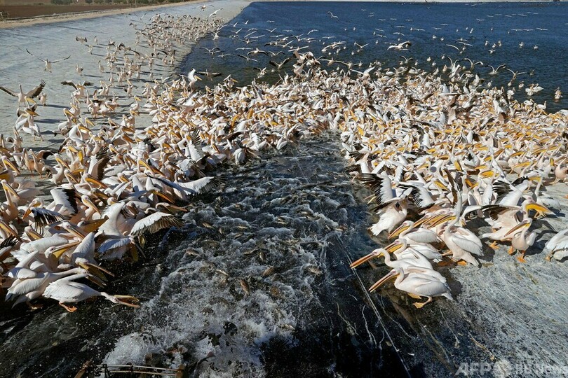 【11月9日 AFP】イスラエル・テルアビブ北郊のエメクヘファ(Emek Hefer)にある貯水池に集まるモモイロペリカンの大群。イスラエルは渡り鳥のペリカンがアフリカと欧州を行き来する際の経路上にあり、地元の養殖業者は養魚場への食害を避けるため、ペリカンに餌を与える。(c)AFP