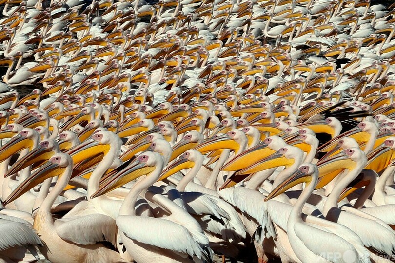 【11月9日 AFP】イスラエル・テルアビブ北郊のエメクヘファ(Emek Hefer)にある貯水池に集まるモモイロペリカンの大群。イスラエルは渡り鳥のペリカンがアフリカと欧州を行き来する際の経路上にあり、地元の養殖業者は養魚場への食害を避けるため、ペリカンに餌を与える。(c)AFP