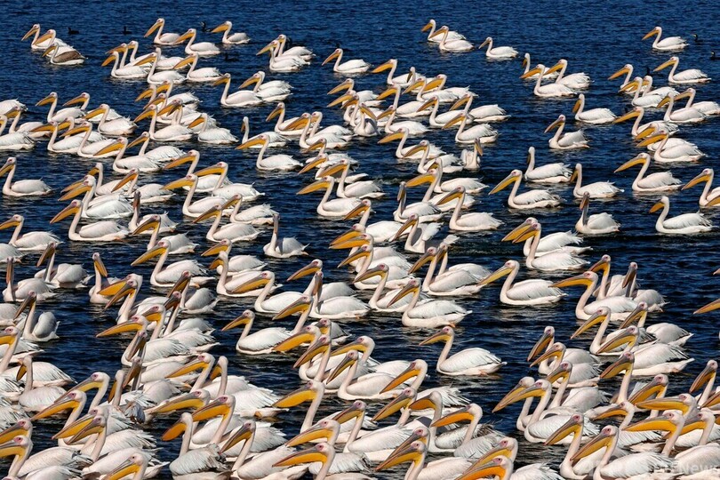 モモイロペリカンの大群、イスラエルで一休み