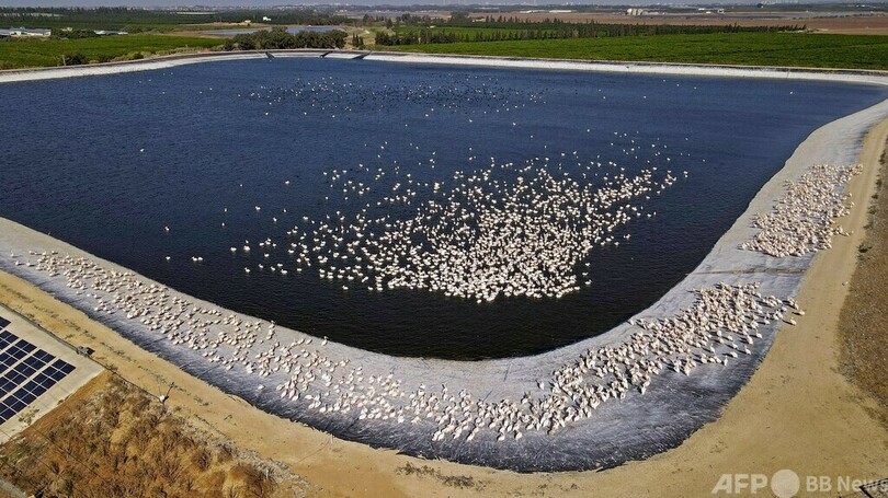 【11月9日 AFP】イスラエル・テルアビブ北郊のエメクヘファ(Emek Hefer)にある貯水池に集まるモモイロペリカンの大群。イスラエルは渡り鳥のペリカンがアフリカと欧州を行き来する際の経路上にあり、地元の養殖業者は養魚場への食害を避けるため、ペリカンに餌を与える。(c)AFP