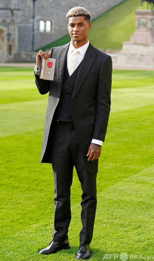 24歳のラシュフォードは、新型コロナウイルスのパンデミック(世界的な大流行)の中で不利な状況に置かれた子どもたちが飢えに苦しまないようにとの取り組みが認められ、この日、ウィンザー城(Windsor Castle)で英国のウィリアム王子(Prince William)から大英勲章第5位のメンバー章(MBE、Member of the Most Excellent Order of the British Empire)を授与された。