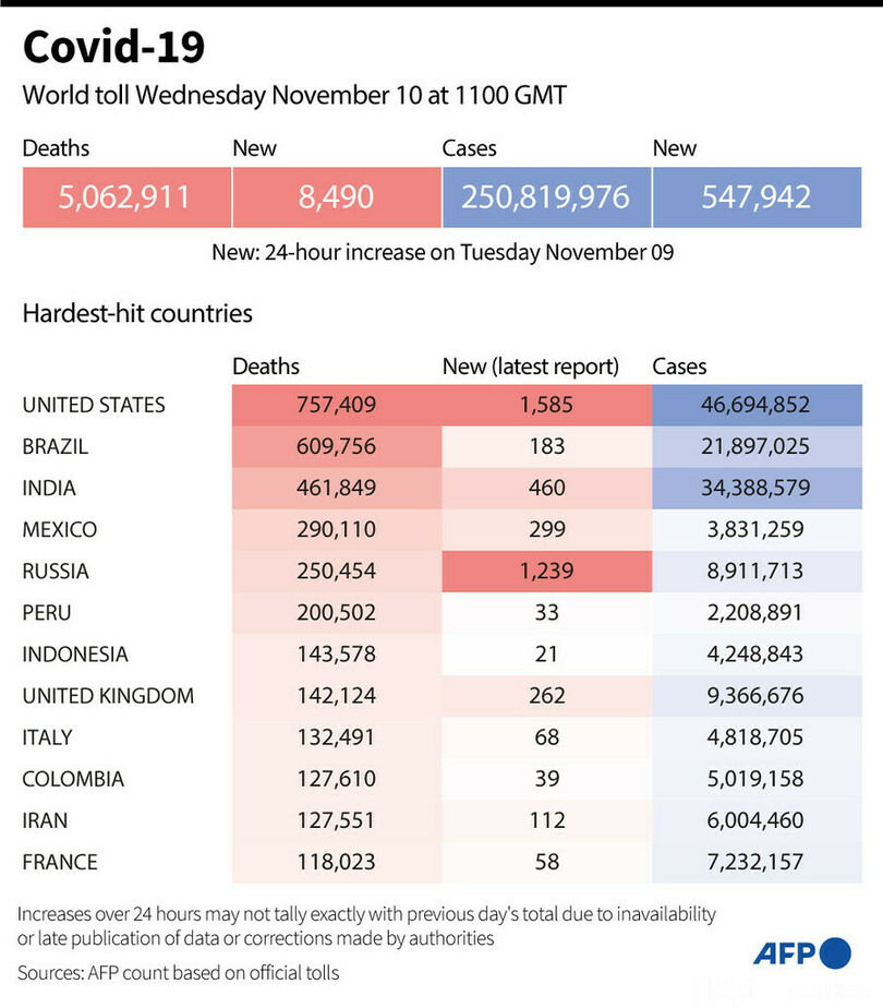 【11月10日 AFP】AFPが各国当局の発表に基づき日本時間10日午後8時にまとめた統計によると、世界の新型コロナウイルスによる死者数は506万2911人に増加した。