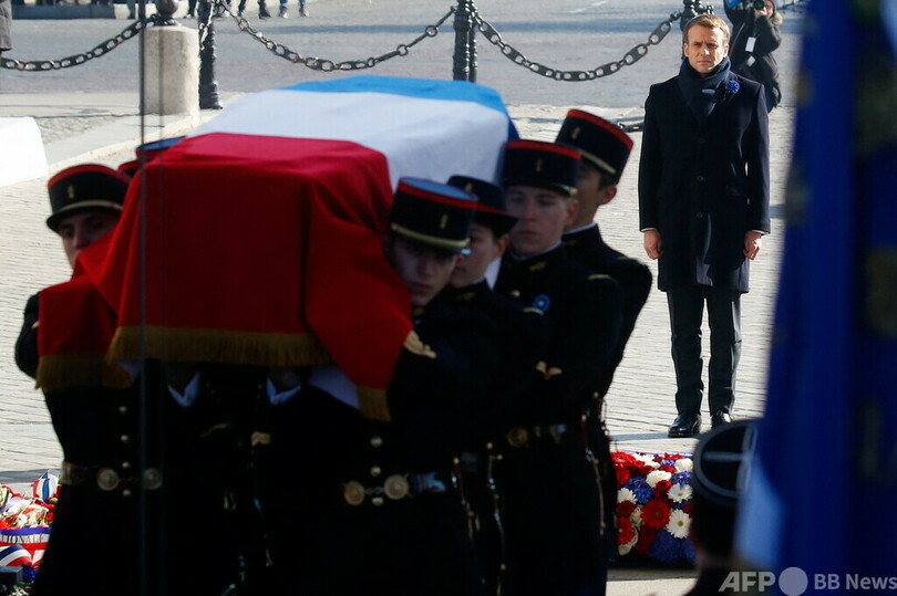 国旗に包まれたジェルマン氏のひつぎは、シャンゼリゼ通り(Champs-Elysees)を抜け、凱旋(がいせん)門(Arc de Triomphe)まで装甲車で運ばれた。式典にはマクロン大統領の他、フランス訪問中のカマラ・ハリス(Kamala Harris)米副大統領も参列した。