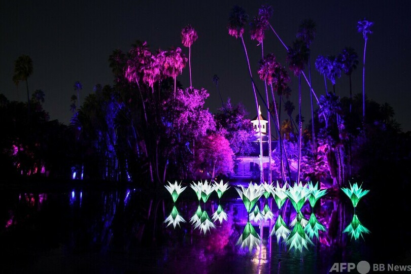 【11月12日 AFP】米カリフォルニア州のロサンゼルス郡立樹木・植物園(Los Angeles County Arboretum and Botanic Garden)で11日、イルミネーション「ライトスケープ(Lightscape)」を楽しむ人々の姿が見られた。全長1マイル(約1.6キロ)の道沿いに光と色、音を使ったインスタレーションが設置された。(c)AFP
