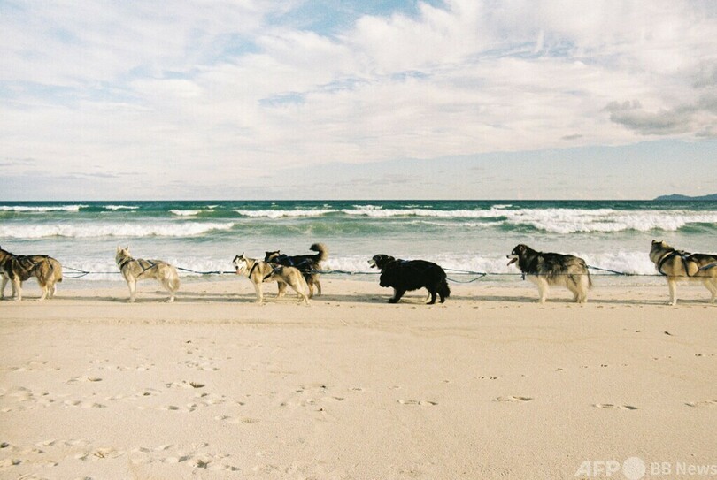 「この時期、人々はそりを引いて空を飛ぶトナカイに注目するでしょうが、私たちにはビーチでそりを引くハスキーたちがいます!」 (c)AFP/Jamie PYATT