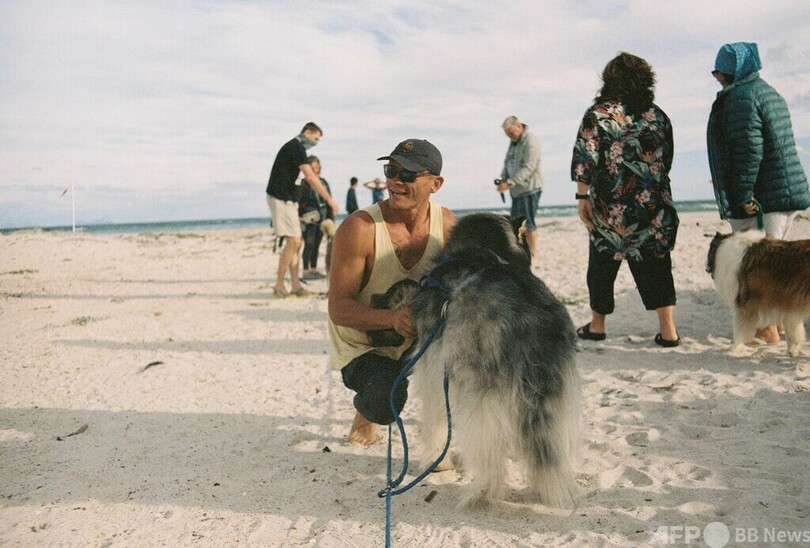 「この時期、人々はそりを引いて空を飛ぶトナカイに注目するでしょうが、私たちにはビーチでそりを引くハスキーたちがいます!」 (c)AFP/Jamie PYATT