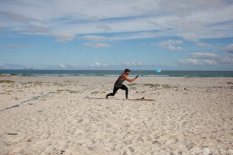 「この時期、人々はそりを引いて空を飛ぶトナカイに注目するでしょうが、私たちにはビーチでそりを引くハスキーたちがいます!」 (c)AFP/Jamie PYATT