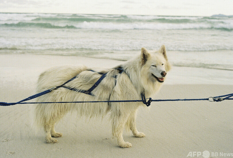 「この時期、人々はそりを引いて空を飛ぶトナカイに注目するでしょうが、私たちにはビーチでそりを引くハスキーたちがいます!」 (c)AFP/Jamie PYATT