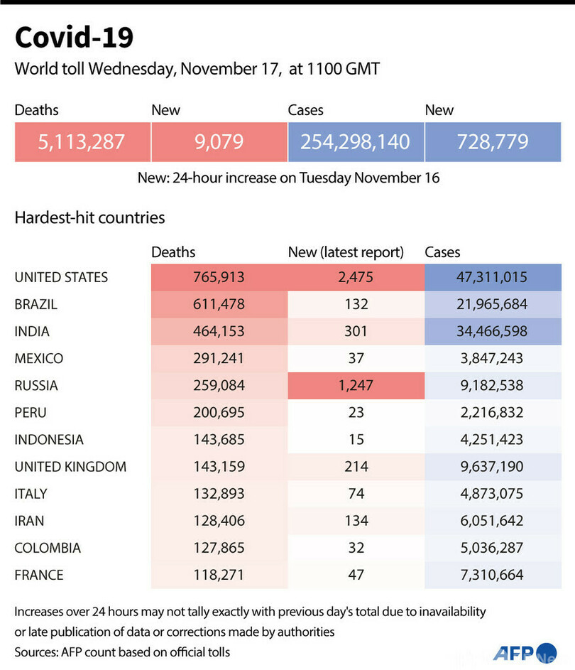 【11月18日 AFP】AFPが各国当局の発表に基づき日本時間17日午後8時にまとめた統計によると、世界の新型コロナウイルスによる死者数は511万3287人に増加した。