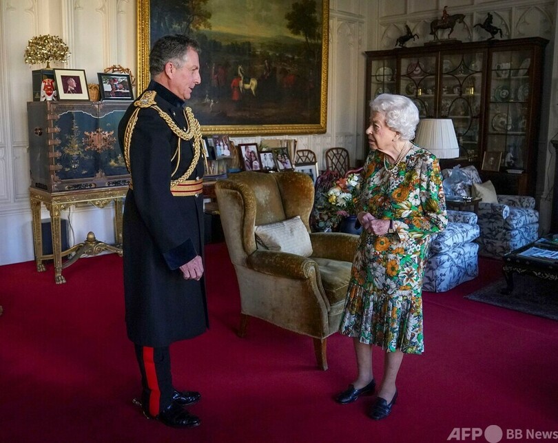 女王は17日、近く退任するニック・カーター(Nick Carter)国防参謀長に接見。10月中旬にはつえを使用する姿を見せていたが、この日は支えなしで立ち、緑、オレンジ、白の花柄のドレスに身を包み、礼服姿のカーター氏と会話を交わした。