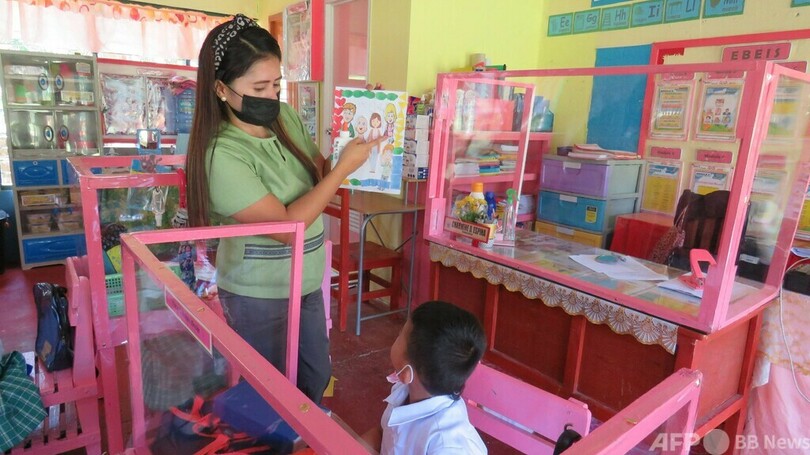 【11月22日 AFP】フィリピン・北ラナオ(Lanao del Norte)州バコロド(Bacolod)の小学校で、対面授業を受け持つ教諭。新型コロナウイルス(COVID-19)のパンデミック(世界的な大流行)の発生後初めて、同国の子どもたちは通学の再開が認められた。(c)AFP