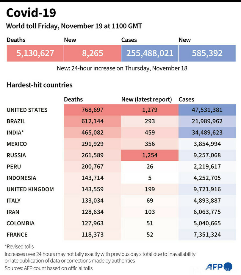 【11月20日 AFP】AFPが各国当局の発表に基づき日本時間19日午後8時にまとめた統計によると、世界の新型コロナウイルスによる死者数は513万627人に増加した。