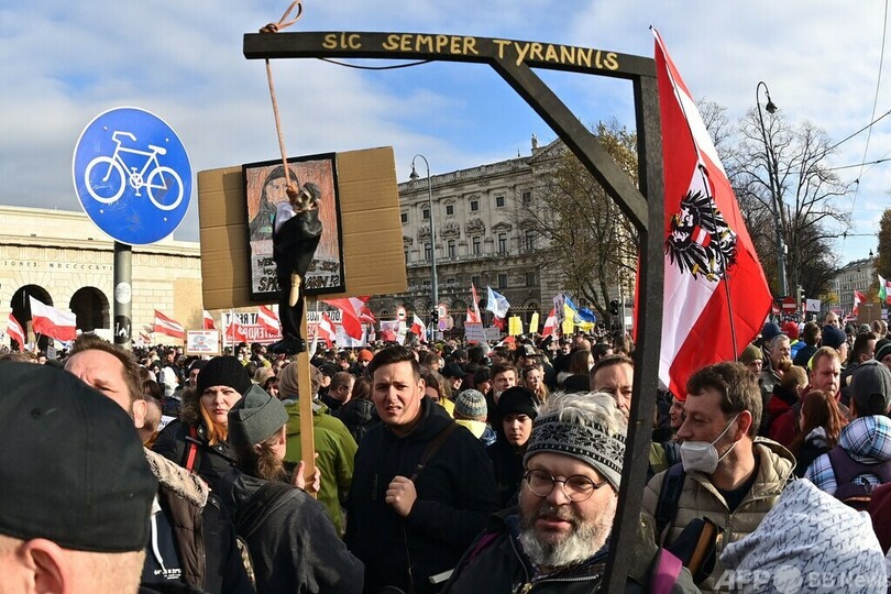 オーストリアでは、約4000人が抗議デモに参加した。ウィーンで行われたデモで参加者は「コロナ独裁」や「社会の分断」などと書かれたプラカードを掲げていた。中にはナチス・ドイツ(Nazi)がユダヤ人に着用させた「ダビデの星(Star of David)」を思わせる黄色い星に「ワクチン未接種」と書かれたワッペンを着けた人もいた。