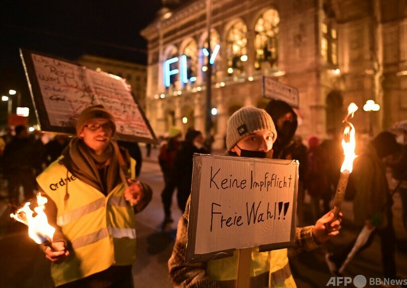 オーストリアでは、約4000人が抗議デモに参加した。ウィーンで行われたデモで参加者は「コロナ独裁」や「社会の分断」などと書かれたプラカードを掲げていた。中にはナチス・ドイツ(Nazi)がユダヤ人に着用させた「ダビデの星(Star of David)」を思わせる黄色い星に「ワクチン未接種」と書かれたワッペンを着けた人もいた。