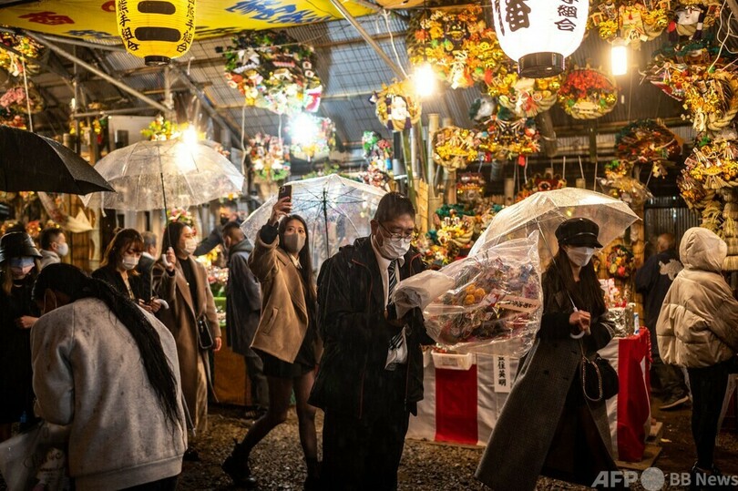 【11月22日 AFP】東京・新宿の花園神社(Hanazono Shrine)で21日、11月恒例の「酉(とり)の市」が行われ、境内は大勢の客でにぎわった。商売繁盛を願い、縁起物の熊手を買い求める人々の姿が見られた。(c)AFP