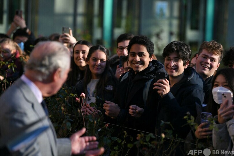 【12月1日 AFP】英イングランド東部にあるケンブリッジ大学(University of Cambridge)ホマートンカレッジ(Homerton College)で、チャールズ皇太子(Prince Charles)を一目見ようと詰め掛けた学生ら。皇太子は、教育へのアクセスや、さまざまな背景を持つ学生を受け入れる大学の構想について知るために同校を訪れた。(c)AFP