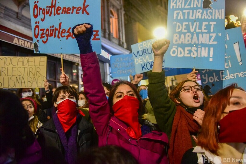 トルコ政府は今年初め、男女平等は伝統的な家族の価値観を損なうとして同条約からの離脱を表明した。権利団体によると、トルコでは今年これまでに345人の女性が殺害されている。(c)AFP