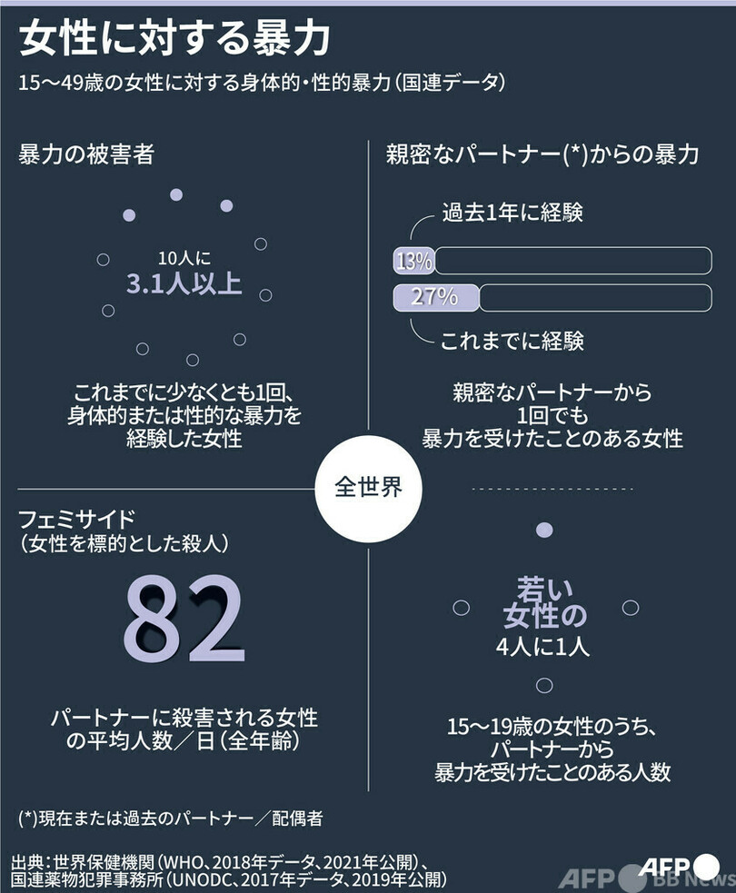 【11月26日 AFP】25日は「女性に対する暴力撤廃の国際デー(International Day for the Elimination of Violence Against Women)」。女性に対する暴力の現状を図にまとめた。(c)AFP