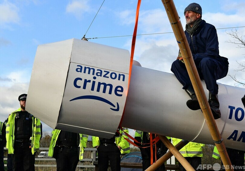 XRが封鎖したのは、英スコットランドのダンファームリン(Dunfermline)にある国内最大のアマゾン倉庫やイングランド各地の施設。活動家らは竹を組んだものなどを使ってアマゾン施設の出入り口を封鎖し、人間の鎖をつくったり、「アマゾンクライム(アマゾンは罪)」「無限の成長、有限の地球」「ブラックフライデーは人と地球を搾取する」などと書かれたプラカードを手にしたりして抗議した。