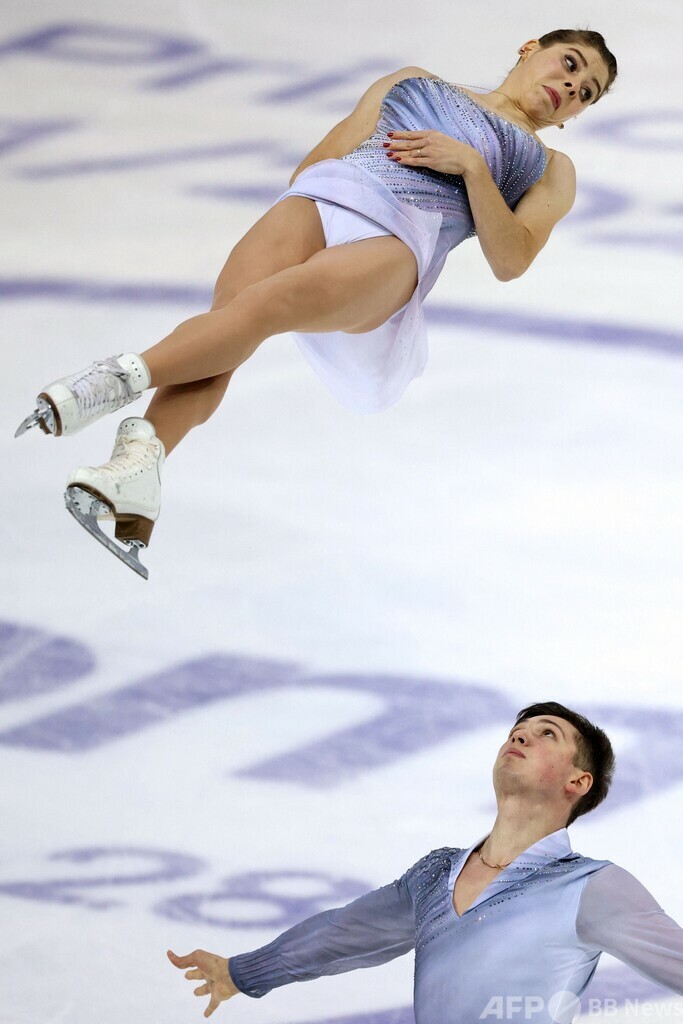 ペアはアナスタシヤ・ミーシナ(Anastasia Mishina)/アレクサンドル・ガリアモフ(Aleksandr Galliamov)組、アイスダンスはヴィクトリヤ・シニツィナ(Victoria Sinitsina)/ニキータ・カツァラポフ(Nikita Katsalapov)組という世界選手権(ISU World Figure Skating Championships 2021)を制しているロシア勢がそれぞれ優勝した。(c)AFP