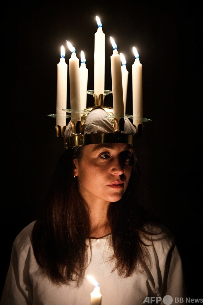 この行事は、3世紀初頭にイタリア・シチリア(Sicily)島で若くして亡くなった聖ルチアを祝うもので、ルチア役の女性がろうそくで作られた冠を頭に載せ、聖歌隊と共に行進することで知られている。(c)AFP