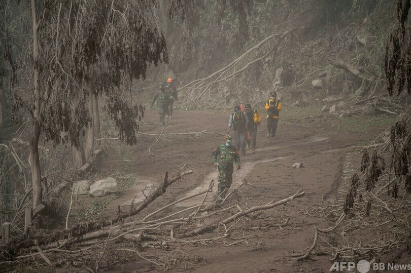 インドネシアの国家防災庁(BNPB)によると、6日夜には死者数が22人に増加。現在も27人が行方不明になっている。スメル山では同日に小規模な噴火があり、一部地域では救助隊が撤退を余儀なくされた。(c)AFP/Haeril Halim
