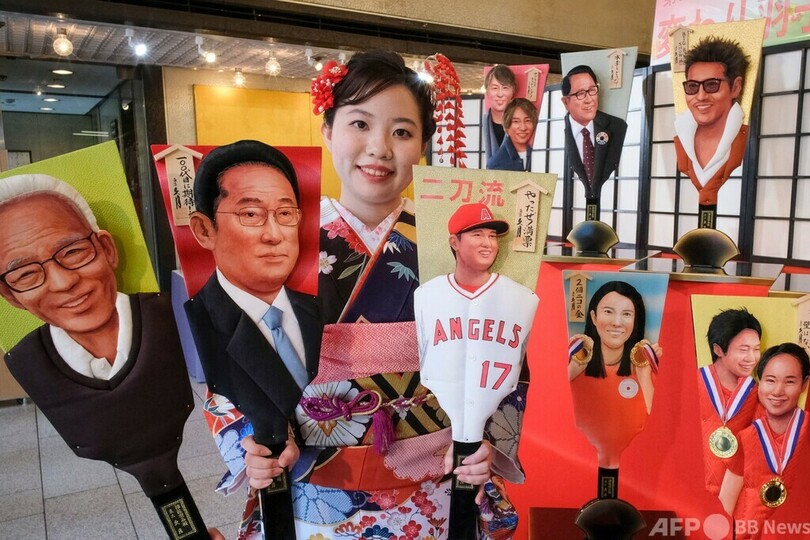 今年は、岸田文雄(Fumio Kishida)首相、米大リーグ(MLB)で投打の二刀流で活躍した大谷翔平(Shohei Ohtani)選手、ノーベル物理学賞(Nobel Prize in Physics)を受賞した真鍋淑郎(Syukuro Manabe)氏らがモチーフとして取り上げられた。(c)AFP