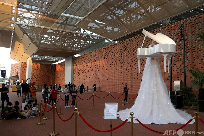【12月11日 AFP】アラブ首長国連邦(UAE)のドバイ(Dubai)で開催中の万国博覧会(World Expo)で、「フライング・ピアノ(Flying Piano)」を弾く伊ベネチア(Venice)のピアニスト、エレアノーラ・コスタンティーニ(Eleanora Costantini)さん(25)。高さ約5メートルまで引き上げられたコスタンティーニさんとピアノを、観客は下から見上げる。この催しは2月まで行われる。(c)AFP