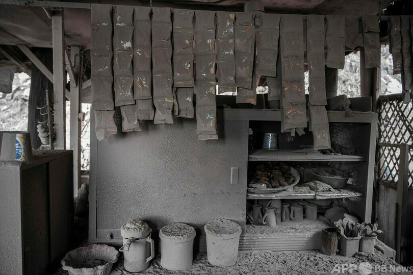 ある家では、すべての部屋が屋根の残がいで埋め尽くされていた。破壊されたドアの向こうにつるされた衣服やリュックサックは、火山灰にすっかり覆われていた。