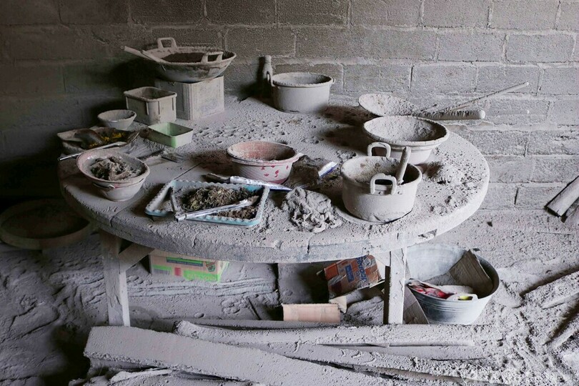 ある家では、すべての部屋が屋根の残がいで埋め尽くされていた。破壊されたドアの向こうにつるされた衣服やリュックサックは、火山灰にすっかり覆われていた。