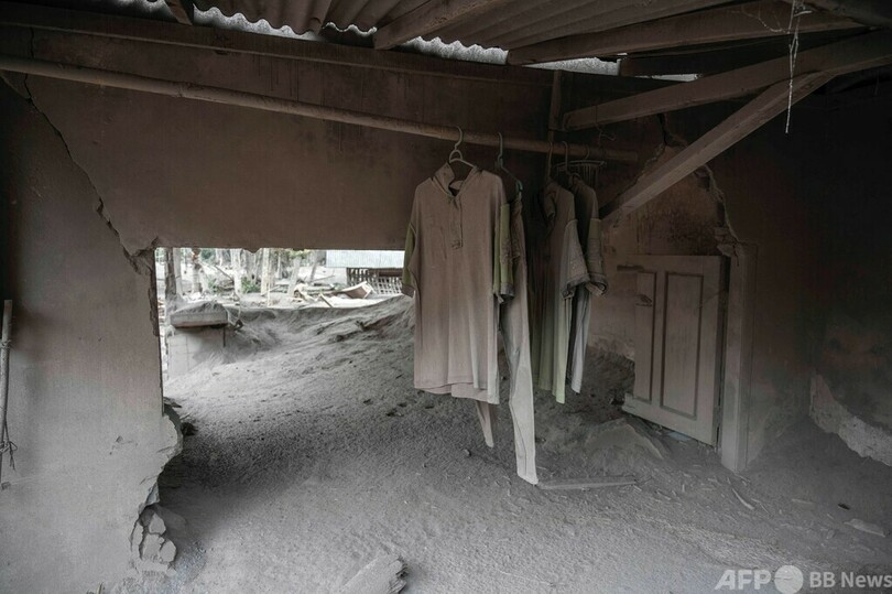 ある家では、すべての部屋が屋根の残がいで埋め尽くされていた。破壊されたドアの向こうにつるされた衣服やリュックサックは、火山灰にすっかり覆われていた。