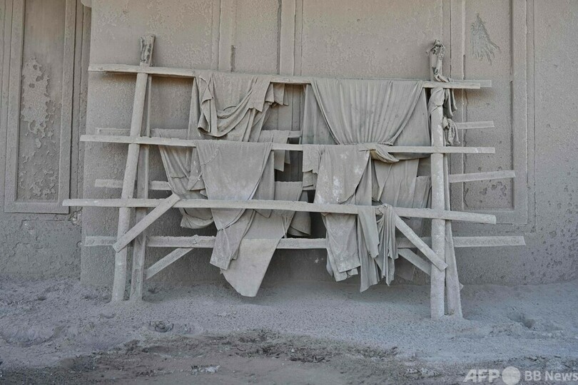 ある家では、すべての部屋が屋根の残がいで埋め尽くされていた。破壊されたドアの向こうにつるされた衣服やリュックサックは、火山灰にすっかり覆われていた。