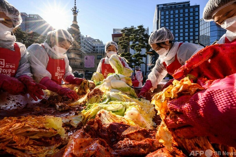 【12月13日 AFP】韓国・ソウルの曹渓寺(Jogyesa)で今月上旬、キムチ作りのイベントが開かれ、約150人の参加者が8000キロの白菜を漬け込んだ。できたキムチの半分は恵まれない家庭や高齢者に、残りは曹渓寺や仏教団体に渡る。(c)AFP