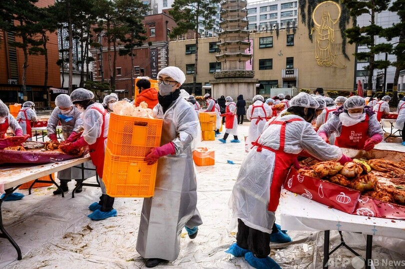 【12月13日 AFP】韓国・ソウルの曹渓寺(Jogyesa)で今月上旬、キムチ作りのイベントが開かれ、約150人の参加者が8000キロの白菜を漬け込んだ。できたキムチの半分は恵まれない家庭や高齢者に、残りは曹渓寺や仏教団体に渡る。(c)AFP
