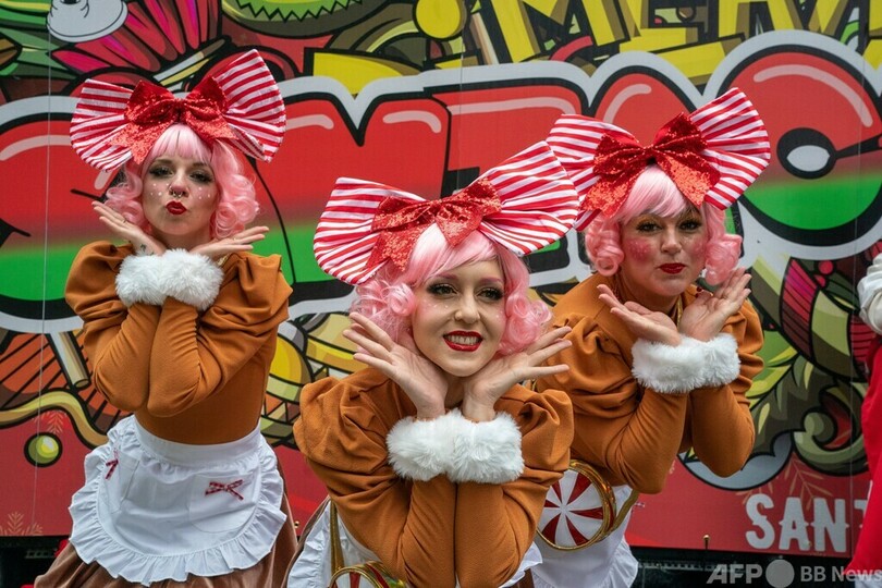 サンタクロースやクリスマスにちなんだ格好をして市内を練り歩き、バー巡りを楽しむチャリティーイベント。昨年は新型コロナウイルス流行により中止されたため、2年ぶりの開催となった。(c)AFP