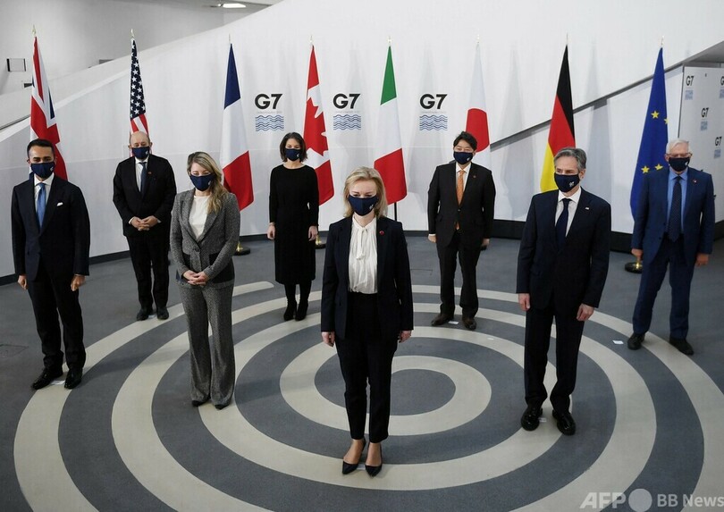 G7外相会合は2日間の日程で開かれる。初日の11日は、ロシアによるウクライナ侵攻危機と、強硬姿勢を強める中国への対応が、議題の中心を占めた。冒頭でリズ・トラス(Liz Truss)英外相は、「自由と民主主義の範囲を狭めようとしている侵略者に立ち向かうため、われわれは強く団結しなければならない」と訴えた。